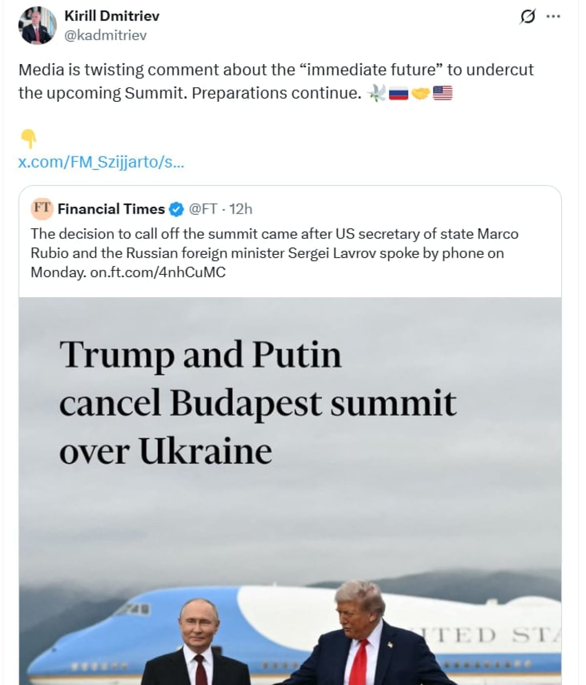Гендиректор російського фонду прямих інвестицій Кирило Дмитрієв, заявив, що повідомлення західних ЗМІ про нібито зупинку підготовки зустрічі між Дональдом Трампом і путіним не відповідають дійсності. Про це він написав у мережі X.