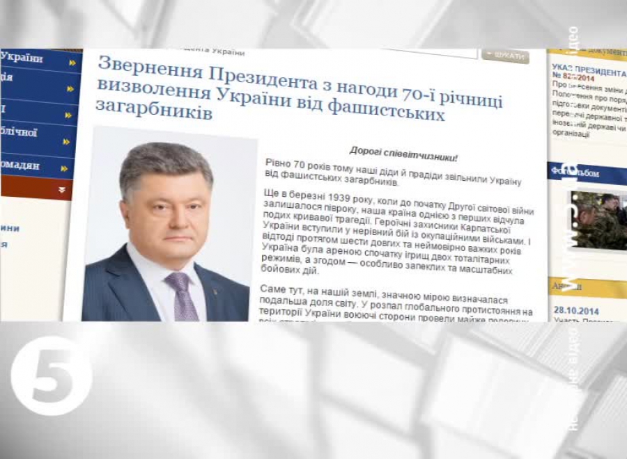 У ньому наголосив - кордони нашої держави були непорушними 70 років, поки до нас знову не повернулася війна. Цього разу вона прийшла не із Заходу, а зі Сходу. Глава держави висловив впевненість, що Україна переможе у цій цитую "Вітчизняній війні 2014 року" і, те що його політико-дипломатичний план таки принесе мир Донбасу.