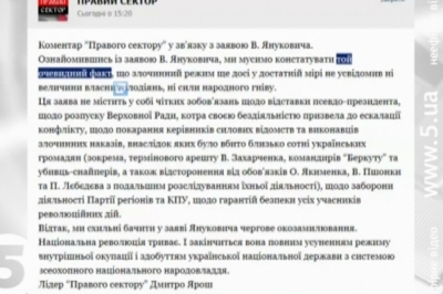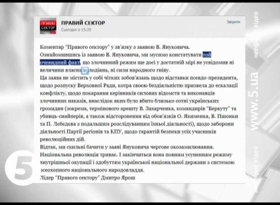 «Правий сектор» і надалі вимагає - відставки президента, розпуску Верховної Ради, покарання керівників силових відомств, що віддавали злочинні накази. А також - заборони Партії регіонів і КПУ та гарантій безпеки для всіх учасників протестів. Допоки ці вимоги не вдовольнять, «Правий сектор» вважатиме що «національна революція триватиме».