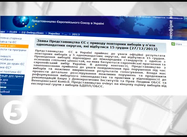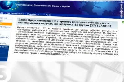 Посольство занепокоєне скаргами людей під час голосування на 5-ти округах 15 грудня та можливим викривленням результатів голосування. Українська влада має провести детальне розслідування ймовірних порушень. А також продовжувати реформувати виборче законодавство згідно з рекомендаціями «Бюро демократичних інститутів з прав людини ОБСЄ і Венеційської комісії», йдеться у заяві представництва ЄС в Україні.