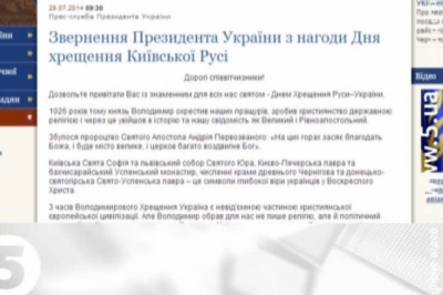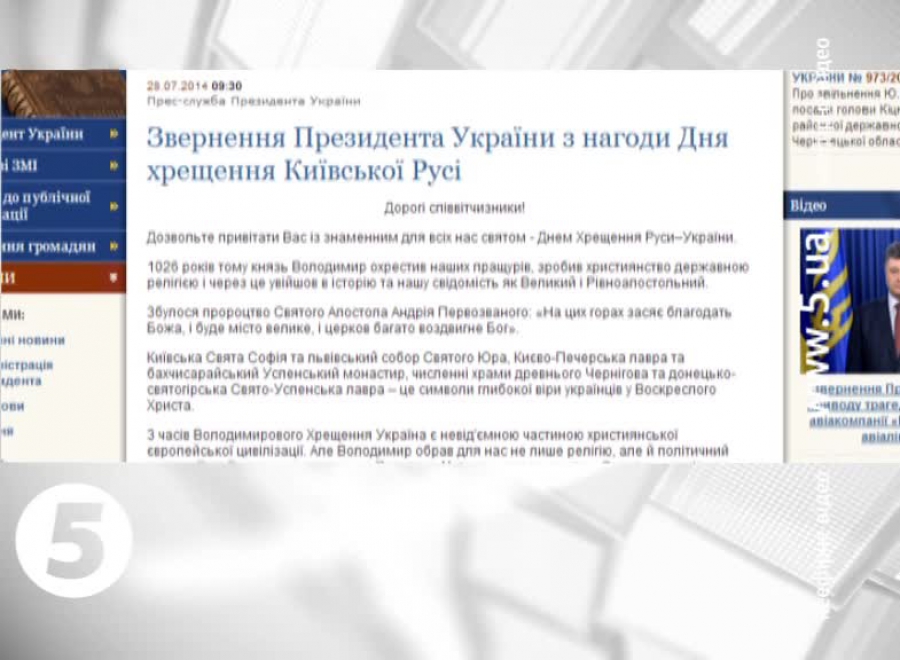 Президент Петро Порошенко привітав українців із Днем хрещення Русі. У своєму зверненні він наголосив, що з часів хрещення Україна є невід'ємною частиною християнської європейської цивілізації, і князь Володимир обрав для країни не лише релігію, а й політичний вектор.