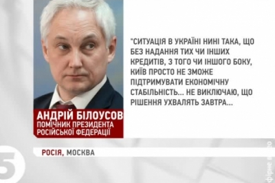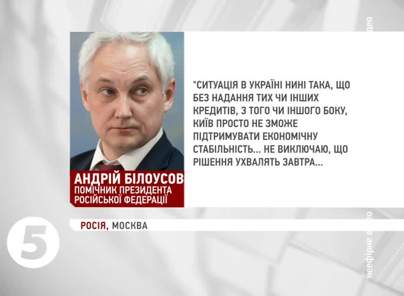 Андрій Білоусов, помічник президента РФ: «Ситуація в Україні нині така, що без надання тих чи інших кредитів, з тої чи іншої сторони, вони просто не зможуть підтримувати економічну стабільність... Не виключаю, що таке рішення ухвалять завтра...»