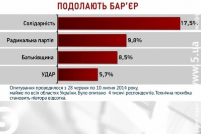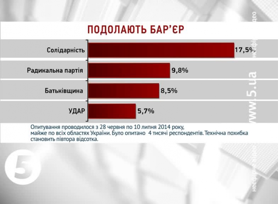 Партії, які б подолали 5 відсотковий бар'єр мали б наступні показники: партія Петра Порошенка "Солідарність "- 17,5 відсотків. Радикальна партія Олега Ляшка - майже 10. Батьківщина, яку очолює Юлія Тимошенко, - 8,5 відсотків. УДАР отримав би майже 6 відсотків голосів.
