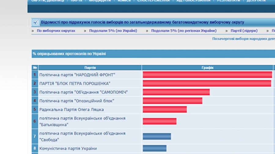 Згідно з даними Центрвиборчкому, продовжує лідирувати список кандидатів від партії "Народний фронт", за який проголосували 21,94% виборців.