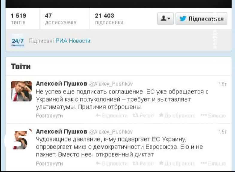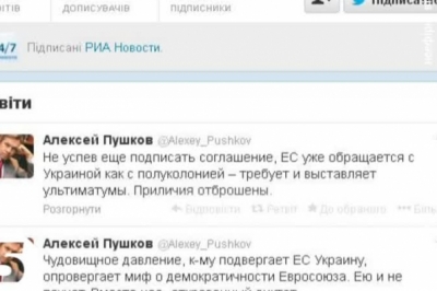 Політик вважає, що ЄС навіть без підписання Угоди поводиться з Україною як із «напівколонією, вимагає та висуває ультиматуми». Цей тиск суперечить уявленню про демократичність Євросоюзу замість неї, на думку Пушкова, у Європі панує відвертий диктат.