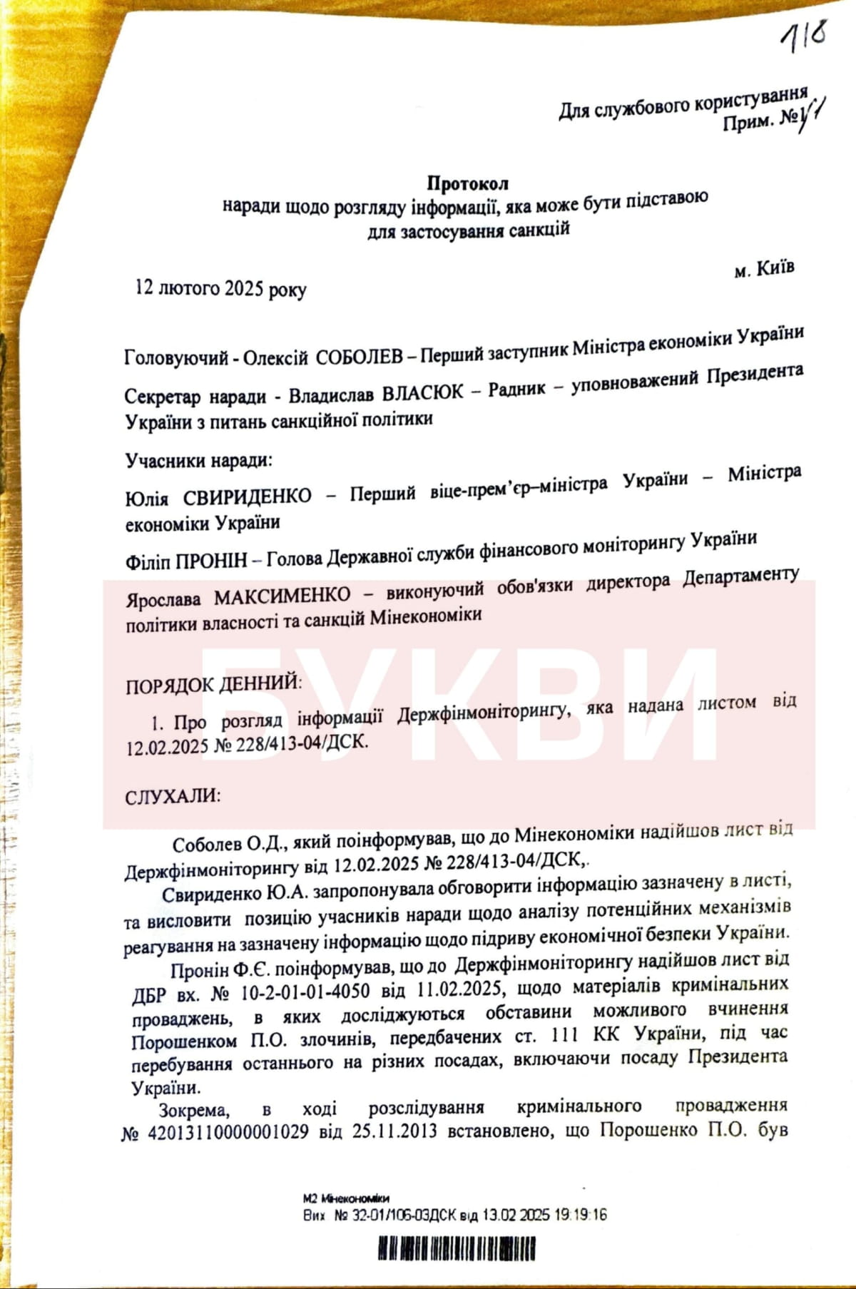 Документи показують, що безпосередньою підставою для санкцій став лист Держфінмоніторингу від 12 лютого 2025 року № 228/413-04/ДСК, який базувався на листі ДБР № 10-2-01-01-40-50 від 11.02.2025. Міністерство економіки підготувало подання до РНБО, а РНБО ухвалила рішення, яке президент ввів у дію – усього за два дні.