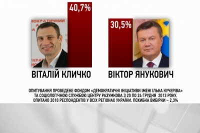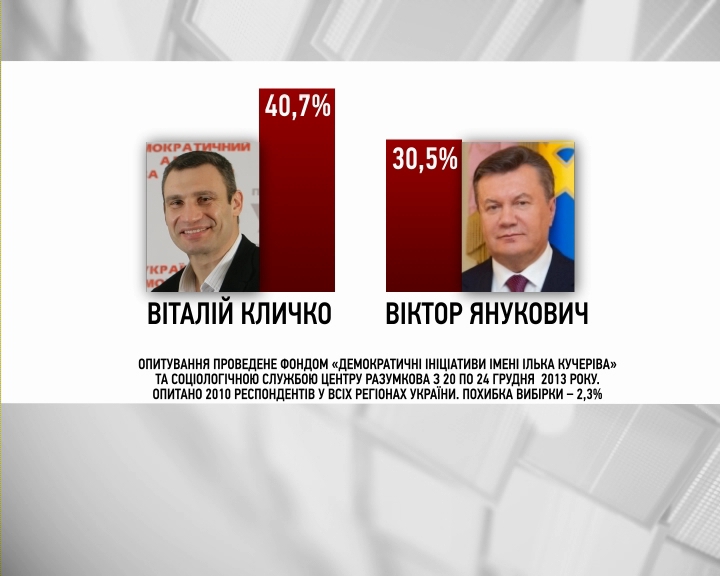 Рівно на п"ять відсотків випереджає главу держави Петро Порошенко. Майже сім відсотків у Віктора Януковича виграє Арсеній Яценюк. І найбільший розрив - понад десять процетів - між Януковичем та Кличком. На користь лідера "Удару".