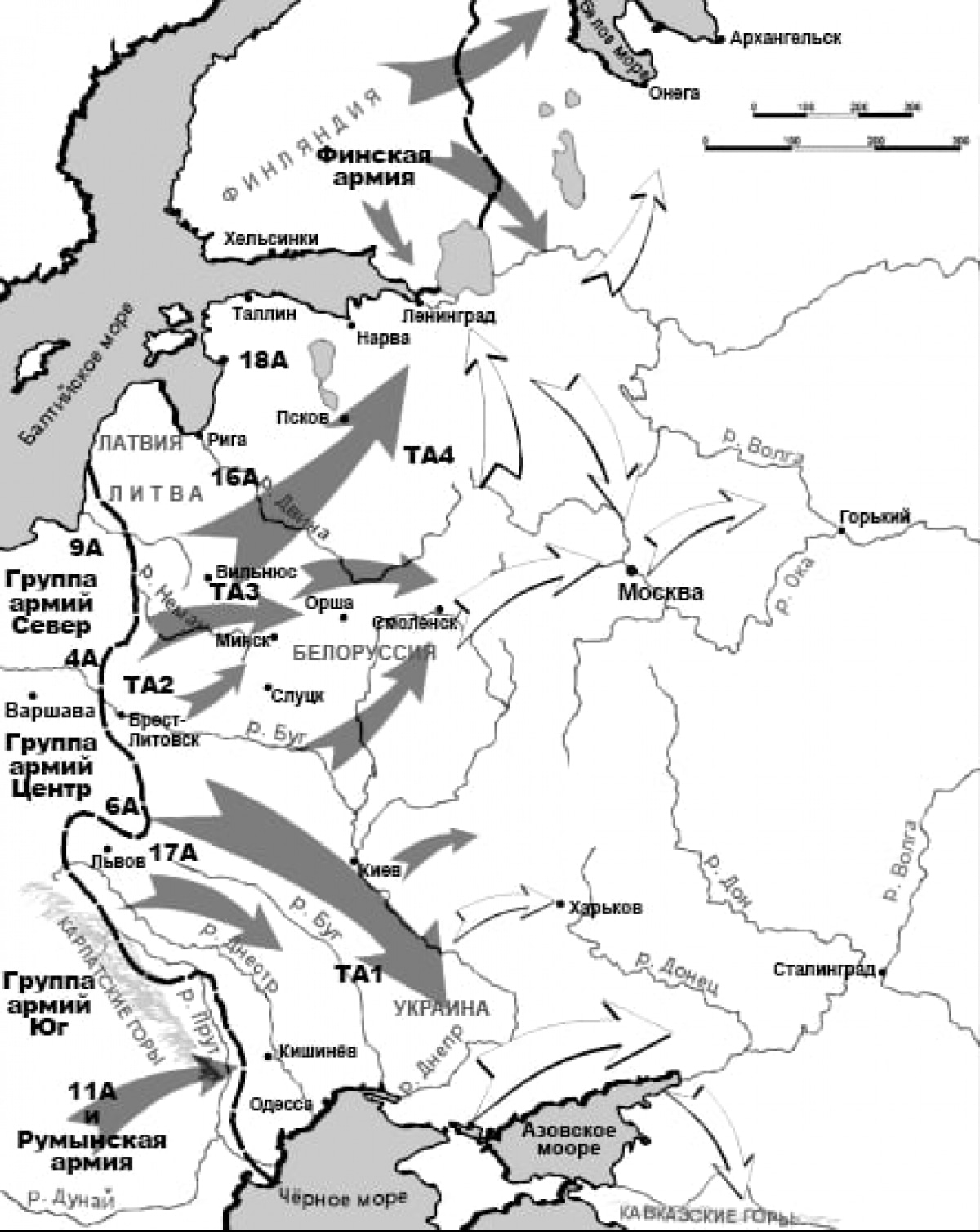 Зазначалося, що "основні сили російських сухопутних військ, розташовані в Західній Росії, повинні бути знищені сміливими операціями шляхом глибокого й швидкого просування танкових клинів", які мали не допустити відходу противника вглиб його території. Наступ мали вести три групи армій: "Південь" – на Україну, "Центр" – на Москву, "Північ" – на Ленінград (нині – Санкт-Петербург). Завершити підготовку нападу планували 15 травня 1941 р.