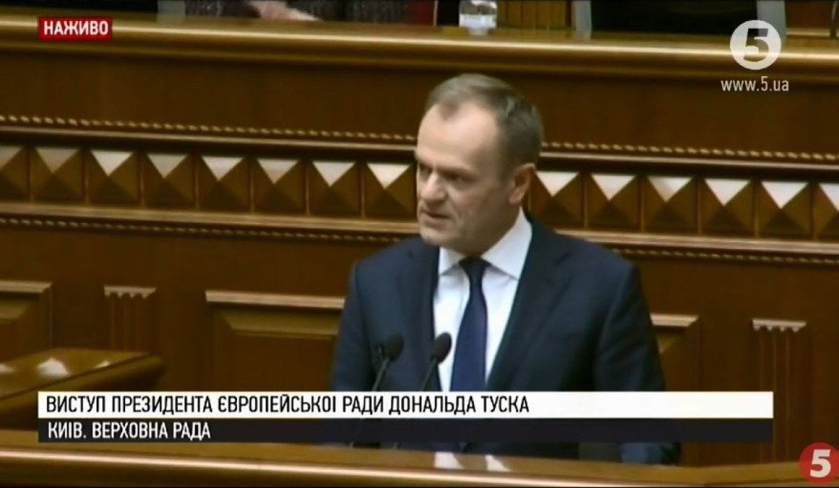 "Сьогодні тут, у Верховній Раді України, можу повторити перед вами не лише від свого імені, але від імені всього Європейського Союзу: "Ми з вами і хочемо вам далі допомагати". Саме тут хочу знову підтверди, що ЄС не змириться з жодним актом насильства в Азовському морі. Перші слова Угоди про асоціацію: Європейський Союз визнає європейські прагнення України і вітає її європейський вибір", – сказав Туск.