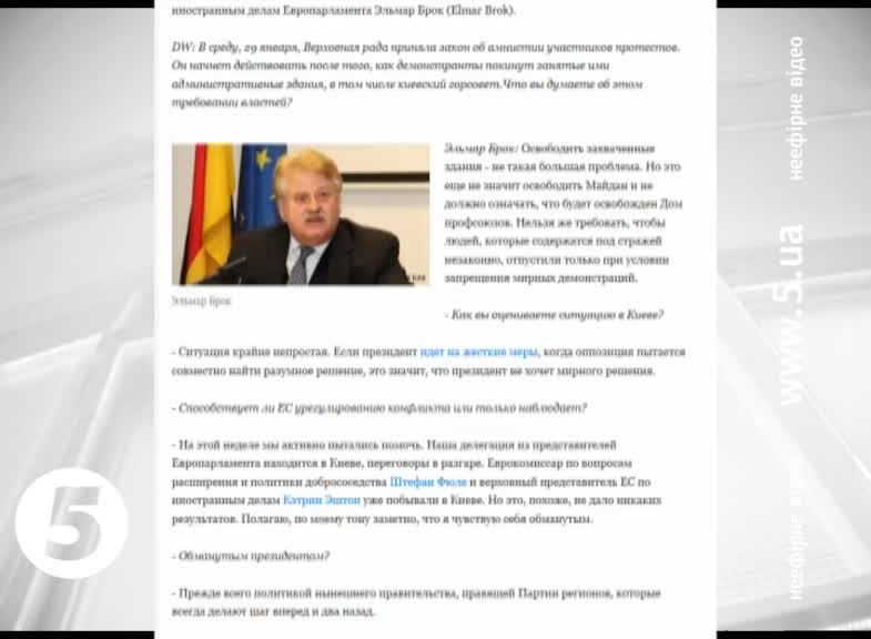 Про таке у інтерв`ю "Дойче Велле" заявив голова комітету з закордонних справ Європарламенту Ельмар Брок. Він різко розкритикував дії української влади. І зазначив : втручання президента у голосування в Верховній Раді сталося в момент, коли депутати були на шляху домовленості про конструктивне рішення. В таких діях Віктора Януковича - Брок вбачає небажання мирного врегулювання конфлікту. Політик зазначив, цитуємо: "Я думаю, це повна втрата реальності у купі з тотальною претензією на владу", кінець цитати. Втім додав, що санкції проти українських чиновників можуть бути запроваджені лише по закінченню переговорів українських влади та опозиції.