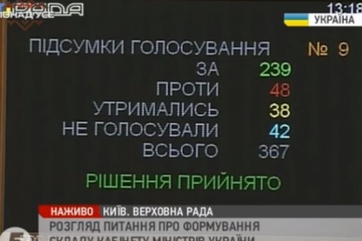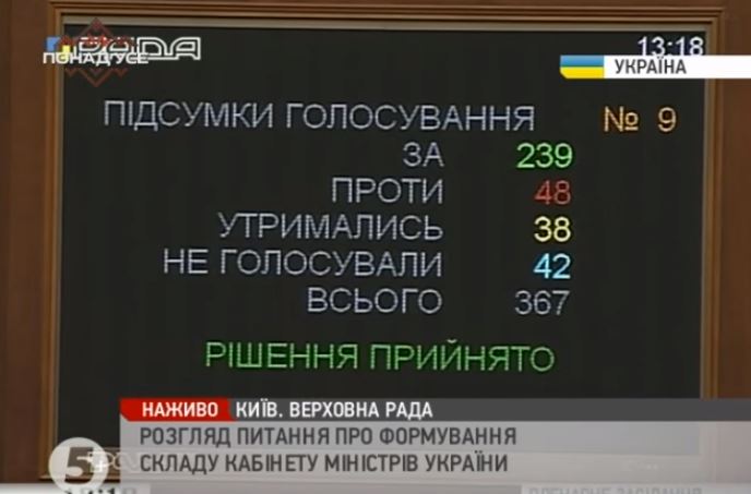 Верховна Рада України проголосувала за новий склад Кабінету міністрів, запропонований новообраним прем'єр-міністром Володимиром Гройсманом. Відповідне рішення підтримали 239 депутатів.