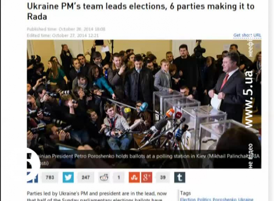 А от російські ЗМІ з привітаннями не поспішають. Англомовний ресурс "Раша Тудей" проєвропейський вибір заперечує – мовляв у низці східних областей більшість голосів набирає "Опозиційний Блок". Ресурс також заявляє про повну підтримку цієї партії з боку Дніпропетровщини. При цьому "Раша Тудей" визнає – перемогу ймовірно отримають партії орієнтовані на Захід. Утім з приводу цього російські журналісти жодних позитивних прогнозів не роблять.
