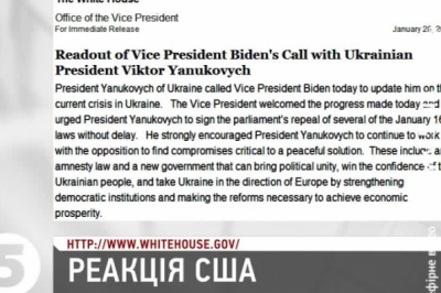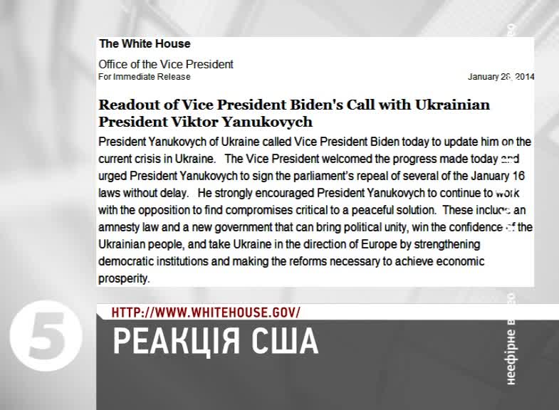 У офіційному повідомленні Білого дому йдеться про те, що український гарант сам зателефонував до Вашингтона, щоби поділитися інформацією про поточну ситуацію в Україні. Байден назвав її прогресом і закликав Януковича якнайшвидше ухвалити скасування парламентом законів від 16 січня, а також – продовжувати спільно з опозицією шукати компроміс для мирного розв’язання кризи. Найважливішими питаннями для України наразі Білий дім вважає закон про амністію і створення нового уряду народної довіри, що зможе провести економічні реформи і прокласти курс у напрямку Європи.