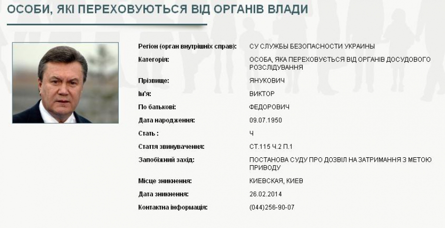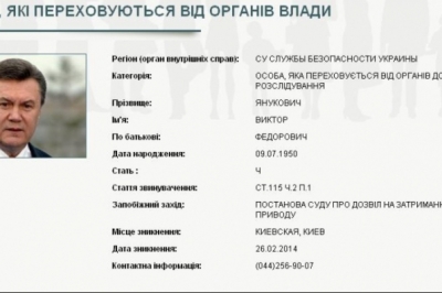 В профілі Януковича сказано, що він розшукується за ст.. 115 ч.2 п.1 (Умисне вбивство двох і більше осіб). Датою оголошення в розшук значиться 26 лютого. Днем раніше, рішення про оголошення Януковича в розшук прийняв Печерський районний суд Києва