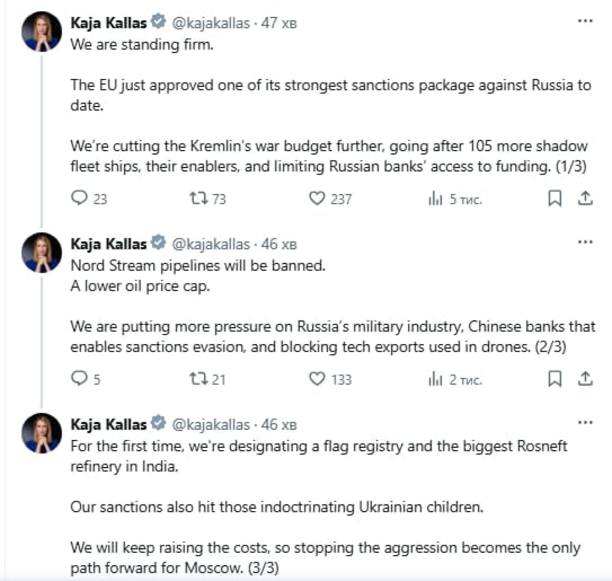 "Сьогодні ЄС ухвалив 18-й пакет санкцій, щоб посилити тиск на росію: ціна на нафту знижена до 47,6 доларів, додано банки та понад 100 суден піддані санкціям, трубопроводи "Північний потік" обмежені.