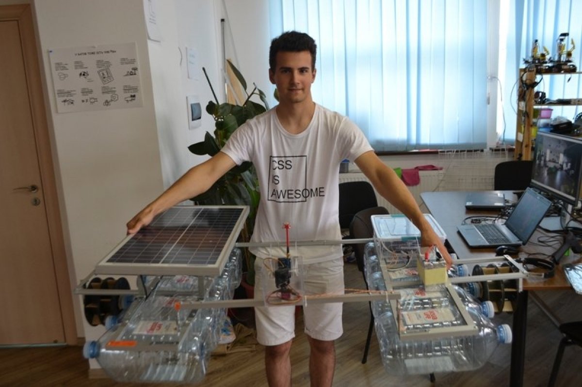"Створити робота, який би збирав річкове сміття, мені запропонував наставник школи програмування Роман Шмельов. Я захопився цією ідеєю. Спочатку докупи прив’язував пляшки, аби майбутній прилад тримався на воді. Робив каркас, паяв схеми і так далі. Наразі робот Riveroni має з обох боків два гребних гвинта, які дозволяють рухатися у будь-який бік, навіть крутитися на місці. У пластикові боксі вміщена вся електроніка: сенсори, GPS, мобільний зв’язок. Паралельно з пластиковим боксом розміщена сонячна батарея, яка дає змогу Riveroni працювати автономно, адже енергії вистачить навіть на роботу у нічний час. Спереду в робота вмонтовано камеру з датчиком, зараз ми його не зробили повністю автономним, тому ним керуватиме оператор. До речі, роботу робота транслюватимуть в онлайн-режимі, ним можна буде керувати на відстані близько п’яти кілометрів", – зазначив розробник.