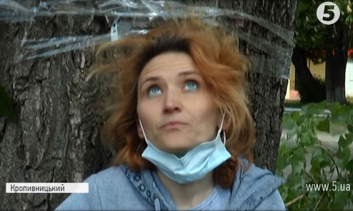 Мешканка Кропивницького Надія Паливода прикувала себе ланцюгом до тополі, щоб її не спиляли. Розповідає: минулими вихідними комунальники зрізали навколо місцевого пологового будинку 14 дерев.