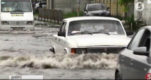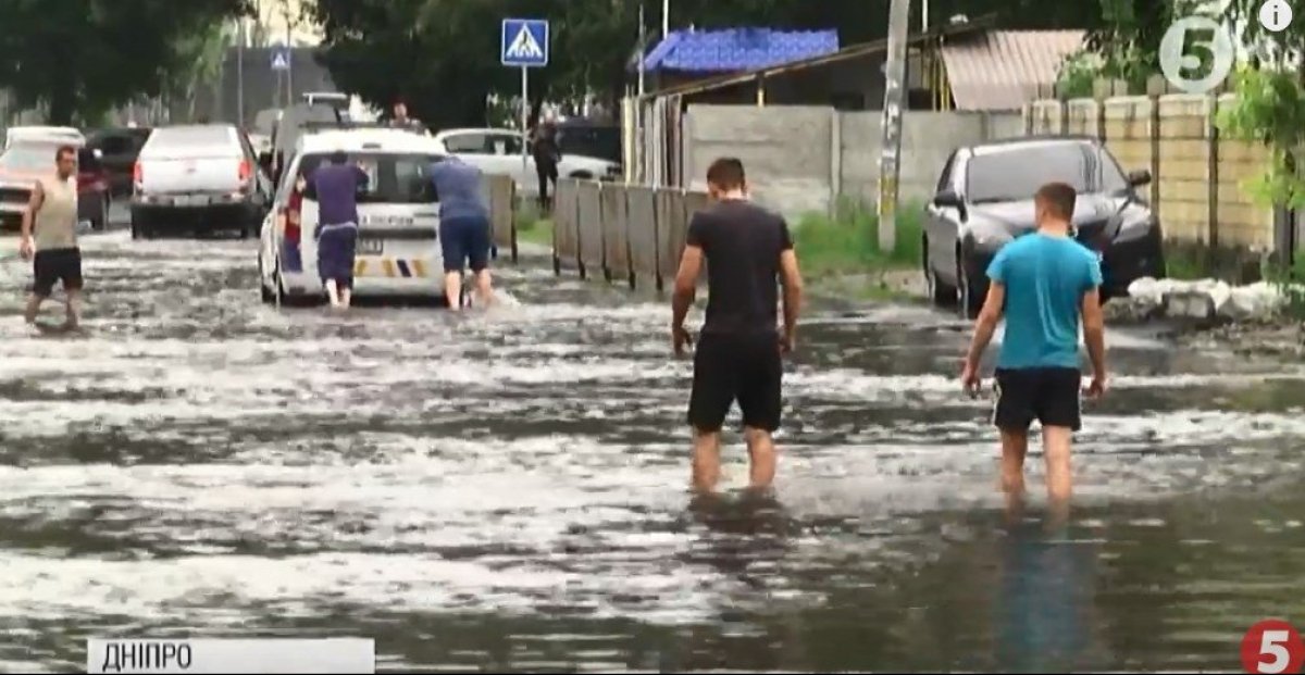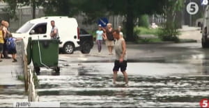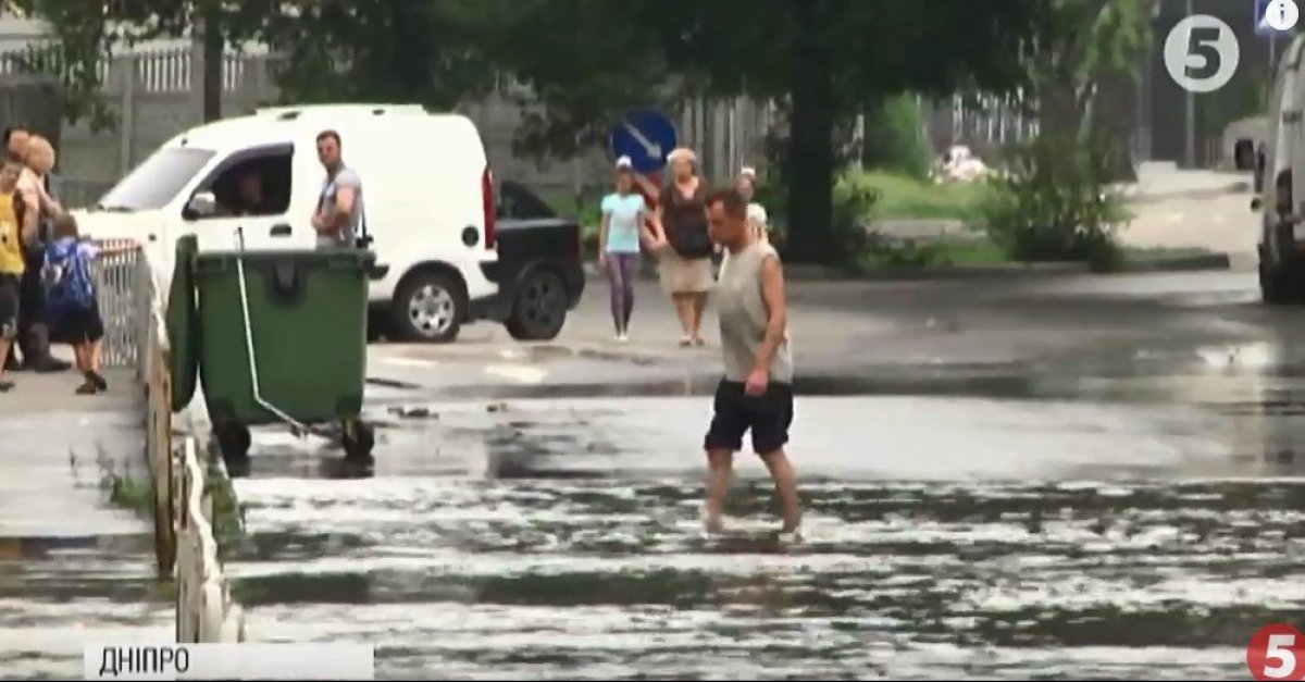 Глибочезна калюжа на дорозі утворилася після злив. Місцеві нарікають: зливний колектор працює погано і його не лагодять. Вода збирається у низині мікрорайону, підтоплює дороги й приватні будинки. У мініатюрному озері пливе й громадський транспорт.