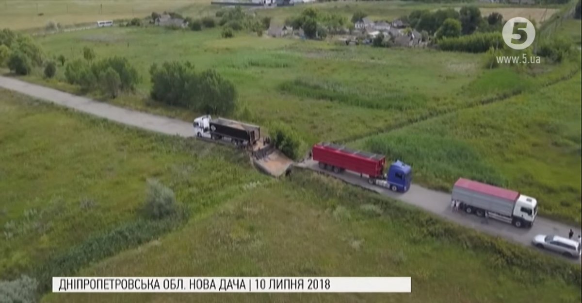 Аварійний міст не витримав ваги вантажівки та обвалився. Сталося це на Дніпропетровщині. Переправа, прокладена через дренажний канал, була об'їзною дорогою села Нова Дача. Після цього, через відсутність альтернативного шляху, увесь транспорт проїжджає через населений пункт. Таким трафіком попід вікнами люди незадоволені.