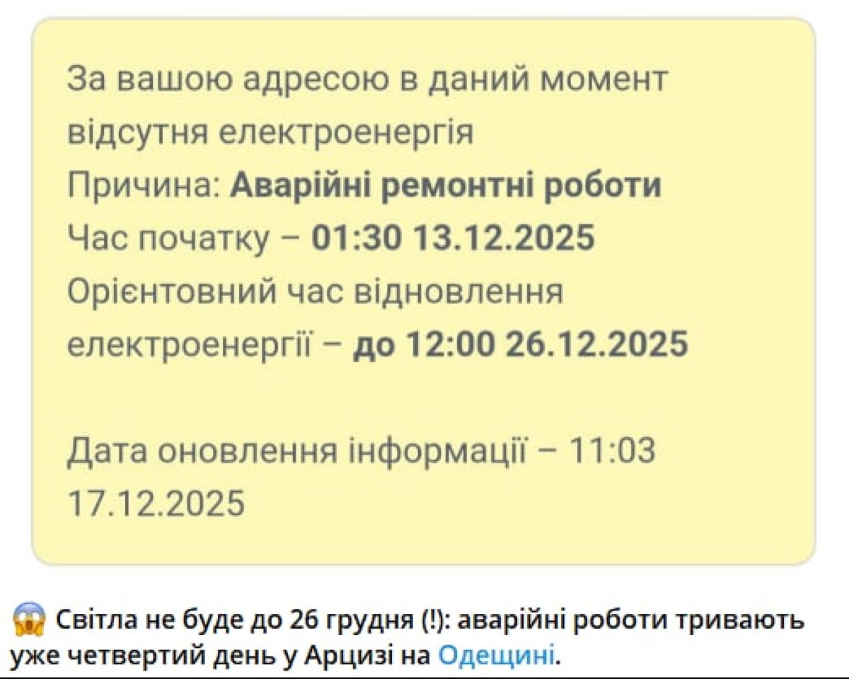 "Світла в Арцизькій громаді не буде до 26 грудня", – йдеться в повідомленні.