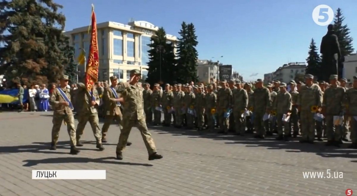 Військових 204-ї Севастопольської бригади тактичної авіації урочисто зустрічають на головній площі Луцька. Діти тримають у руках повітряні кульки, квіти та малюнки для захисників.