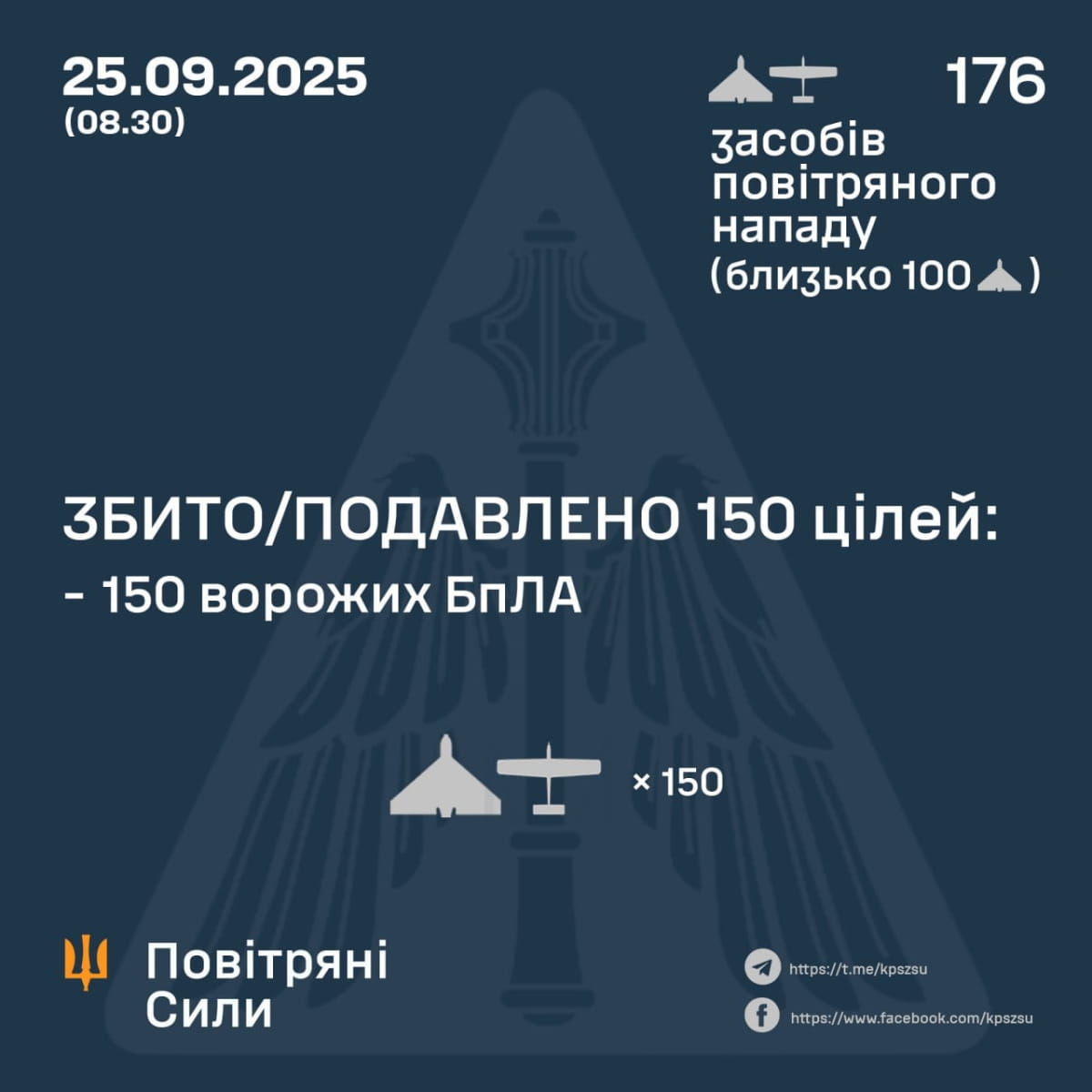 У ніч на 25 вересня противник атакував Україну 176-ма ударними БпЛА типу Shahed, Гербера і безпілотниками інших типів. Про це повідомляють Повітряні сили.