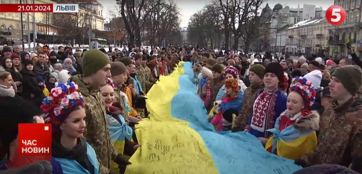 Найбільший український прапор із побажаннями від військових та дітей. Рекорд України зафіксували у Львові. Стяг демонстрували на головній площі міста. Підписи збирали по всій Україні.