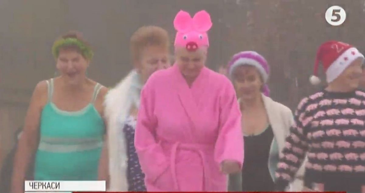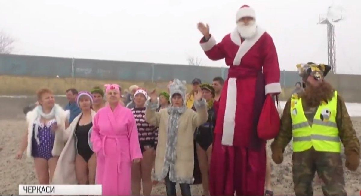 Червоні капелюхи, новорічна мішура, Дід Мороз на ходулях та святковий настрій – у перший день нового року учасники "Клубу довголіття" уже вдосвіта прямують до Дніпра, щоб поплавати.