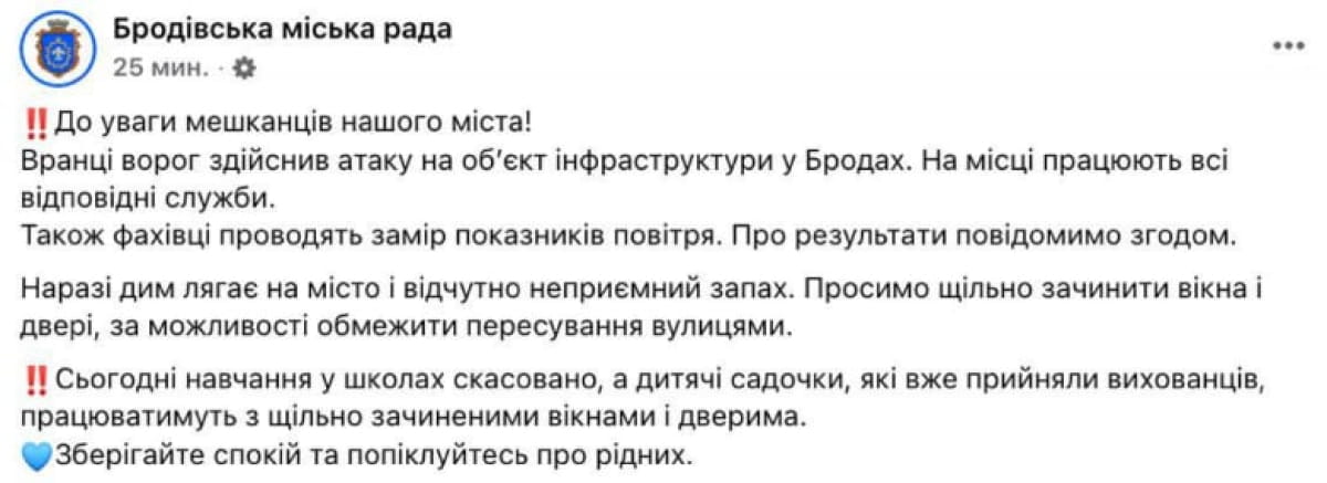 "Ворог здійснив атаку на об'єкт інфраструктури у Бродах. На місці працюють всі відповідні служби. Фахівці проводять замір показників повітря. Наразі дим лягає на місто і відчутно неприємний запах", – йдеться в повідомленні.