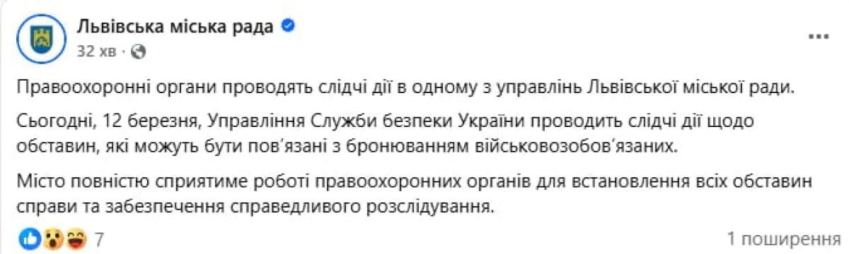 "Служба безпеки спільно з Львівською обласною прокуратурою проводить санкціоновані обшуки в окремих приміщеннях Львівської міської ради та підпорядкованого їй комунального підприємства. Наразі перевіряється інформація про можливу протиправну діяльність деяких посадовців", – зазначили в СБУ.