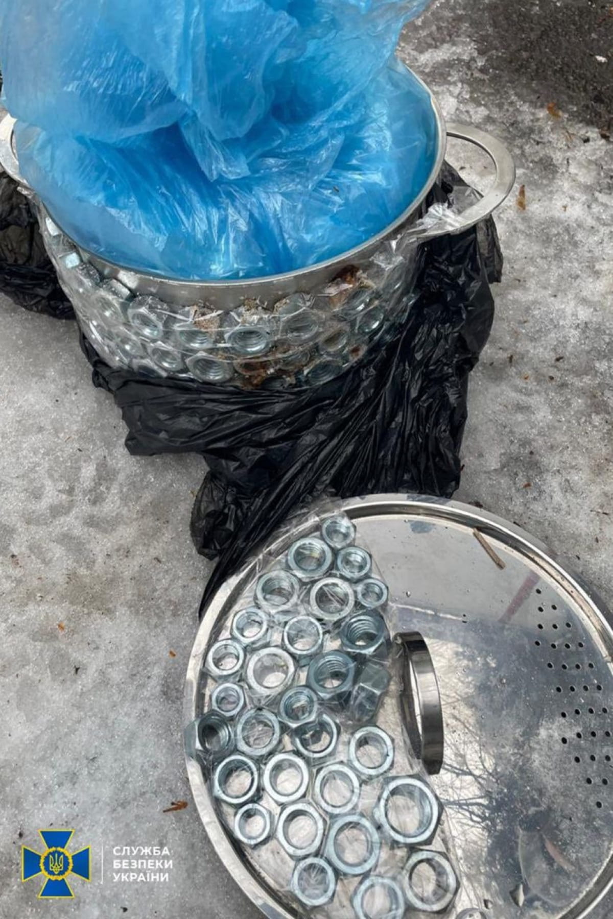 Встановлено, що зловмисник замаскував вибухівку в каструлі та спорядив її гайками для підсилення уражаючої дії.