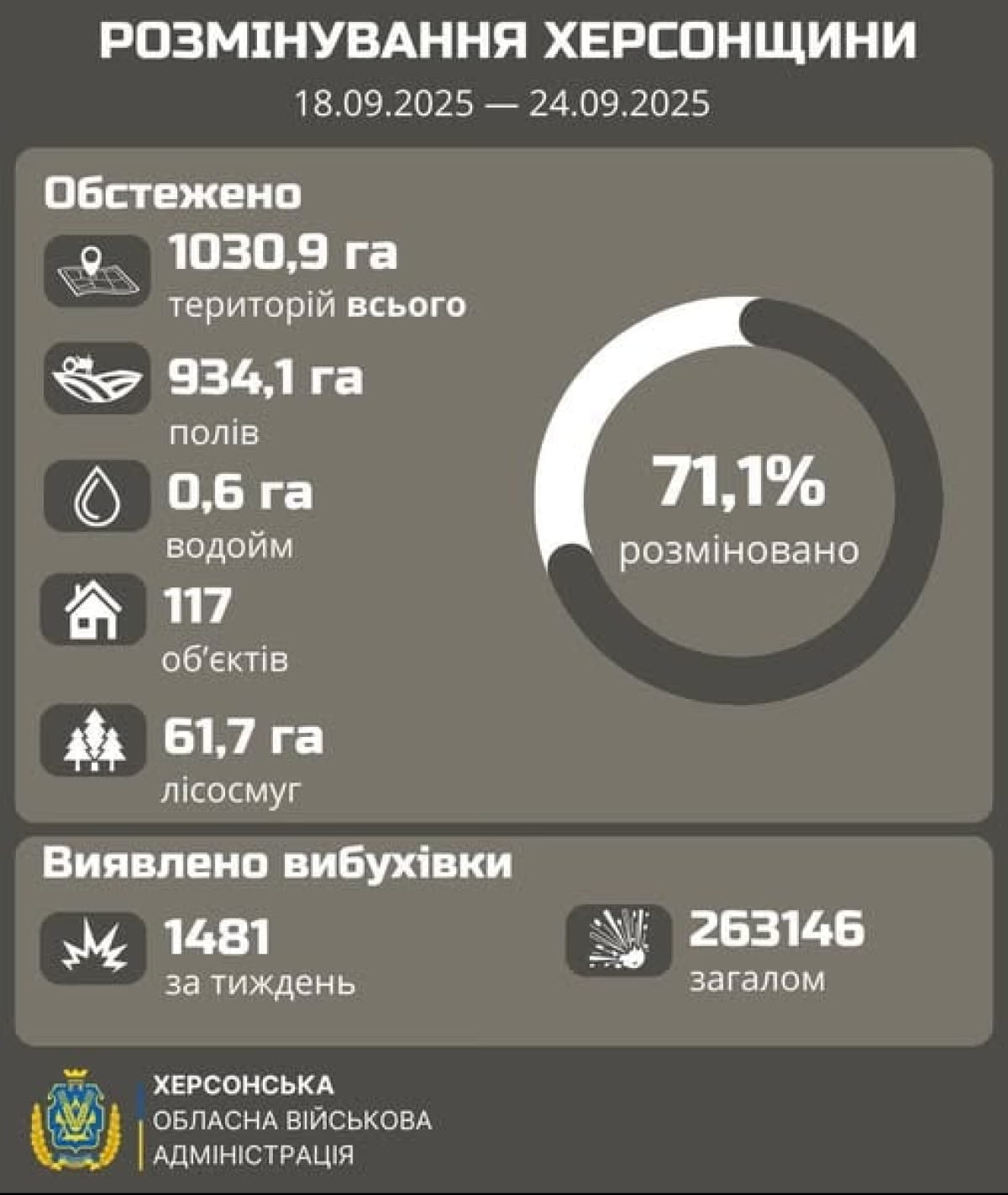 "Загалом уже розміновано 71,1% території правобережжя Херсонської області", – йдеться в повідомленні.