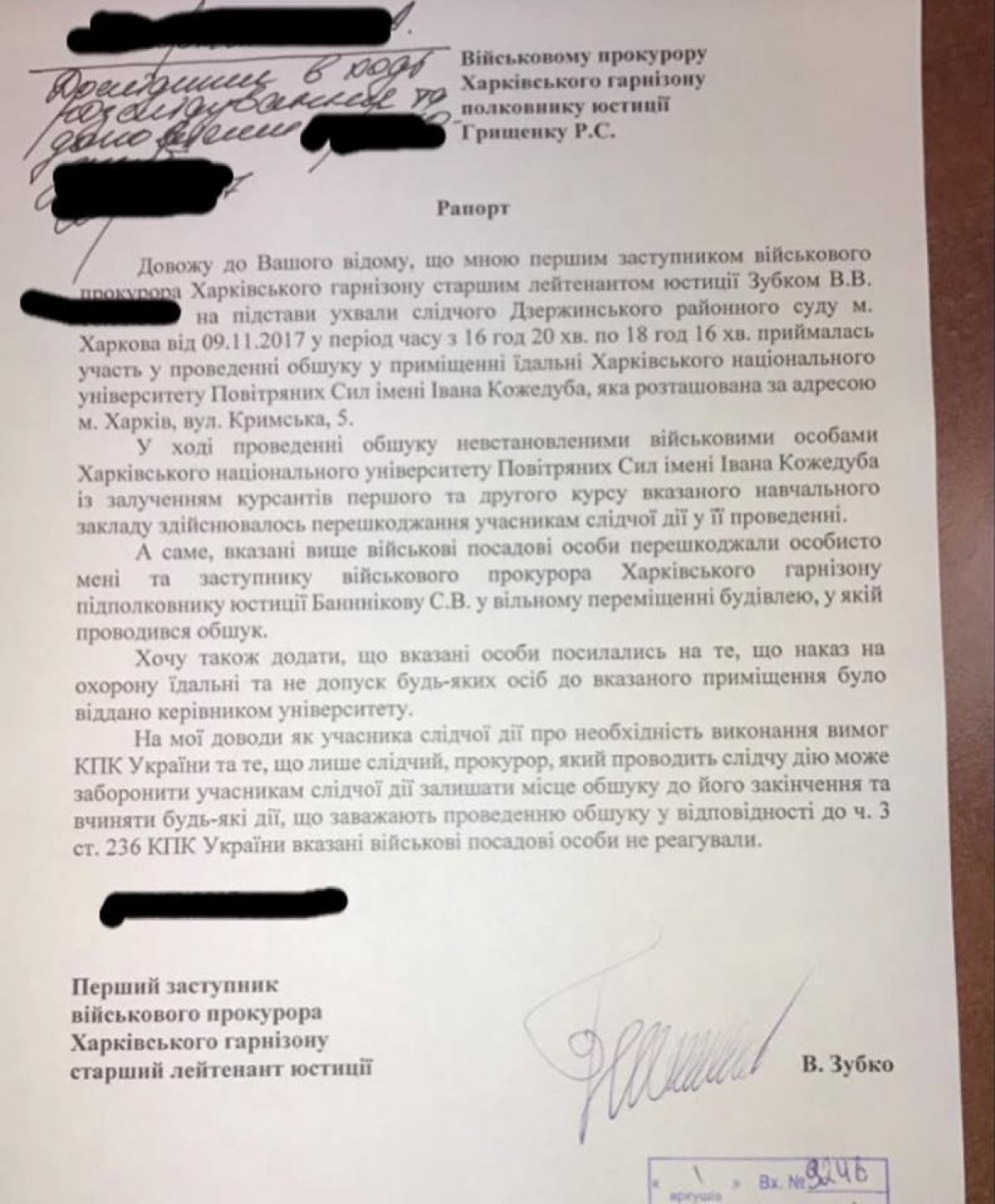 Він також написав, що військові прокурори Харківського гарнізону, у зв'язку із розслідуванням розкрадань в Харківському Національному інституті Повітряних сил, йшли не на склади боєприпасів, а в курсантську їдальню!