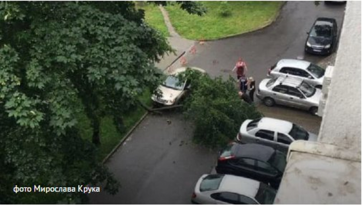 Його водійка саме вийшла з авто, коли на нього впало дерево. Жінка не постраждала, проте заяву до поліції написала.