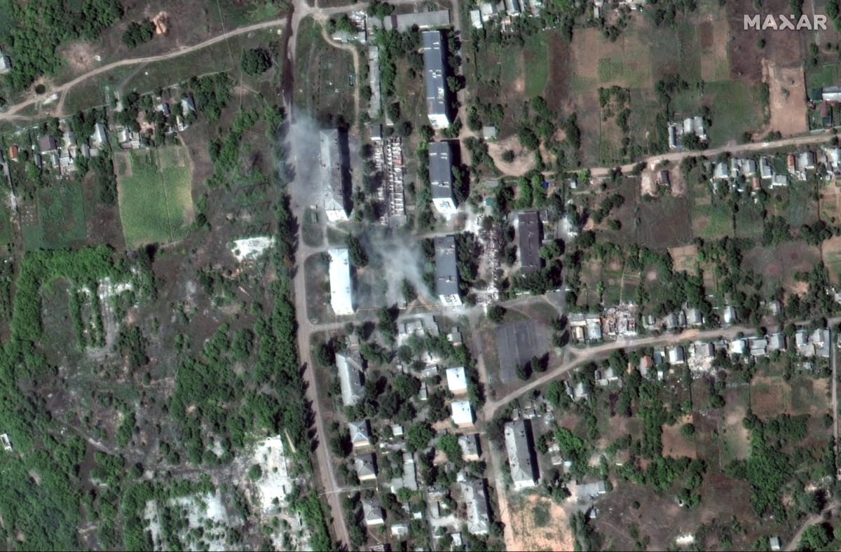 На цих знімках зображений Соледар – на початку серпня та зараз, зі знищеними будівлями.