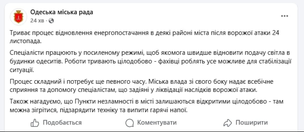 Водночас Одеська міськрада повідомляє, що триває процес відновлення енергопостачання в деякі районі міста.