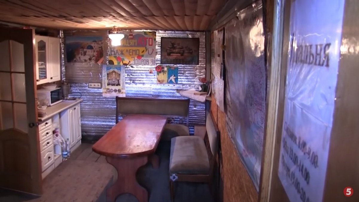 "Це наша їдальня. Ми тут всі збираємося, вечеряємо, обідаємо. Тут же поруч і готуємо їжу. Облаштовуємо собі побут, як можемо", – розповідає боєць, влаштувавши імпровізовану екскурсію. У кімнаті, поруч із простим самоваром, можна помітити досить модернову мікрохвильову піч. Ще тут є імпровізований новорічний куток та навіть – працюючий електропатефон з вініловими платівками до нього.