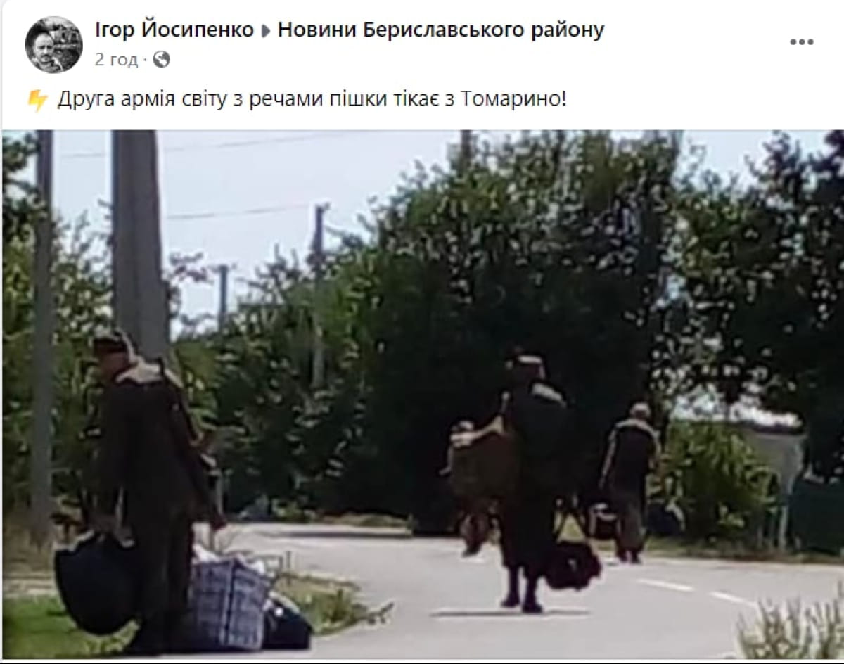 Депутат Херсонської облради Ігор Йосипенко опублікував фото, на якому, за його словами, зафіксовано, як військові російської окупаційної армії пішки тікають із Томариного, прихопивши з собою напхані доверху торби.