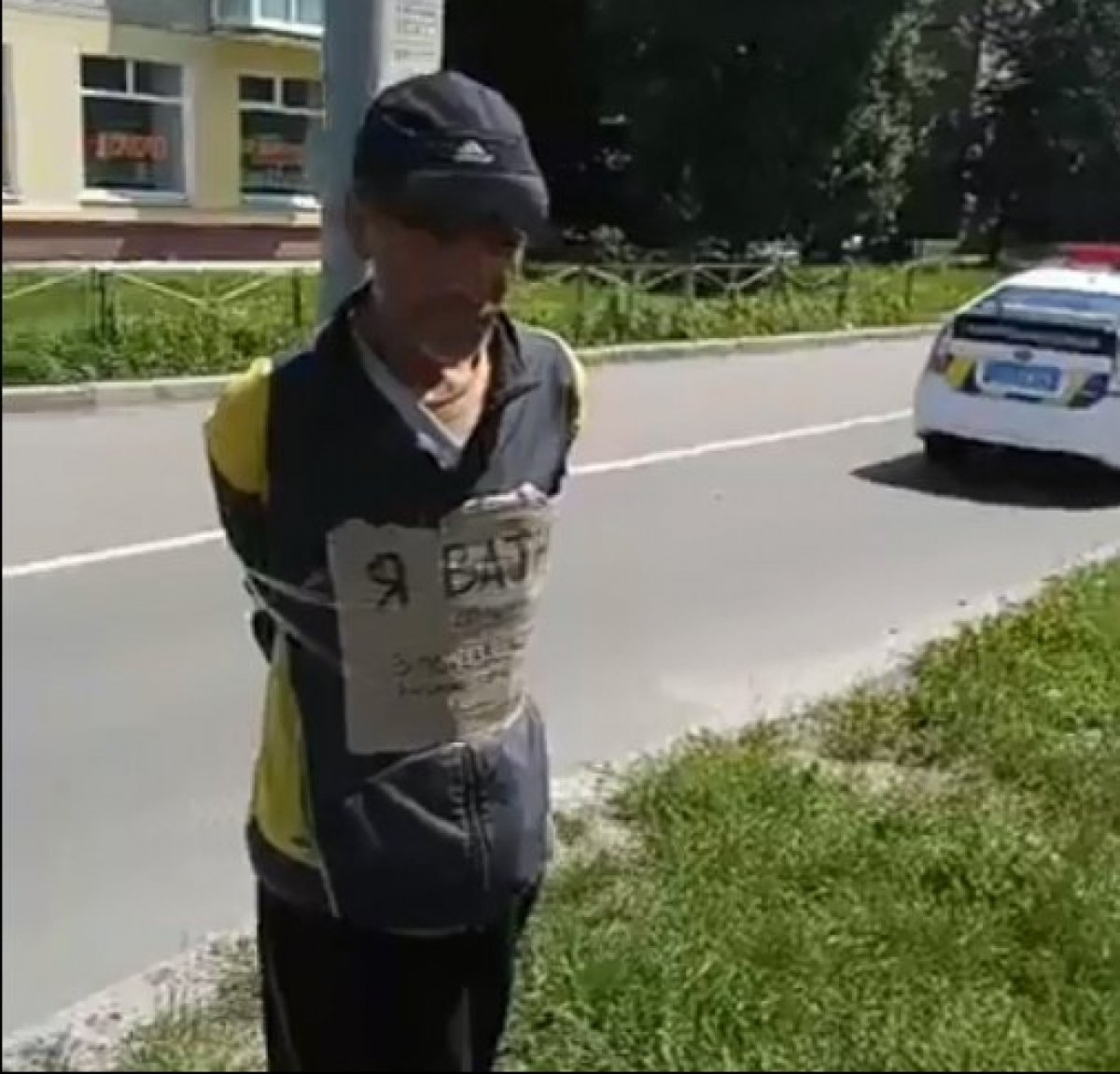 На номер "102" надійшов виклик, що в Чернігові по вулиці Шевченка до стовпа зі знаком "Пішохідний перехід" прив'язано чоловіка з табличкою "Я ватник".