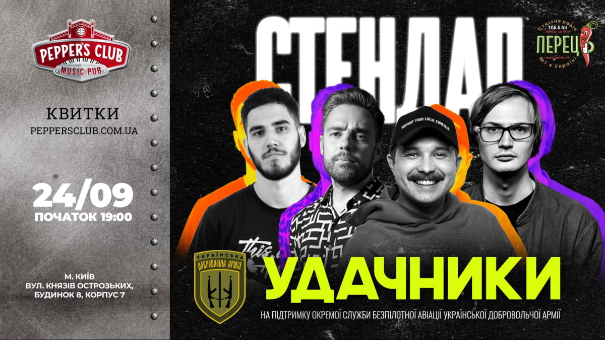На сцене Pepper's – Антон Тимошенко, Роман Щербан, Александр Качура и Женя Коротков. Четверо стендап-комиков с разными голосами, бэкграундами и стилями объединяются ради общей цели – собрать средства для аэроразведки Украинской Добровольческой Армии. Медиапартнер мероприятия – радио "Перец FM".