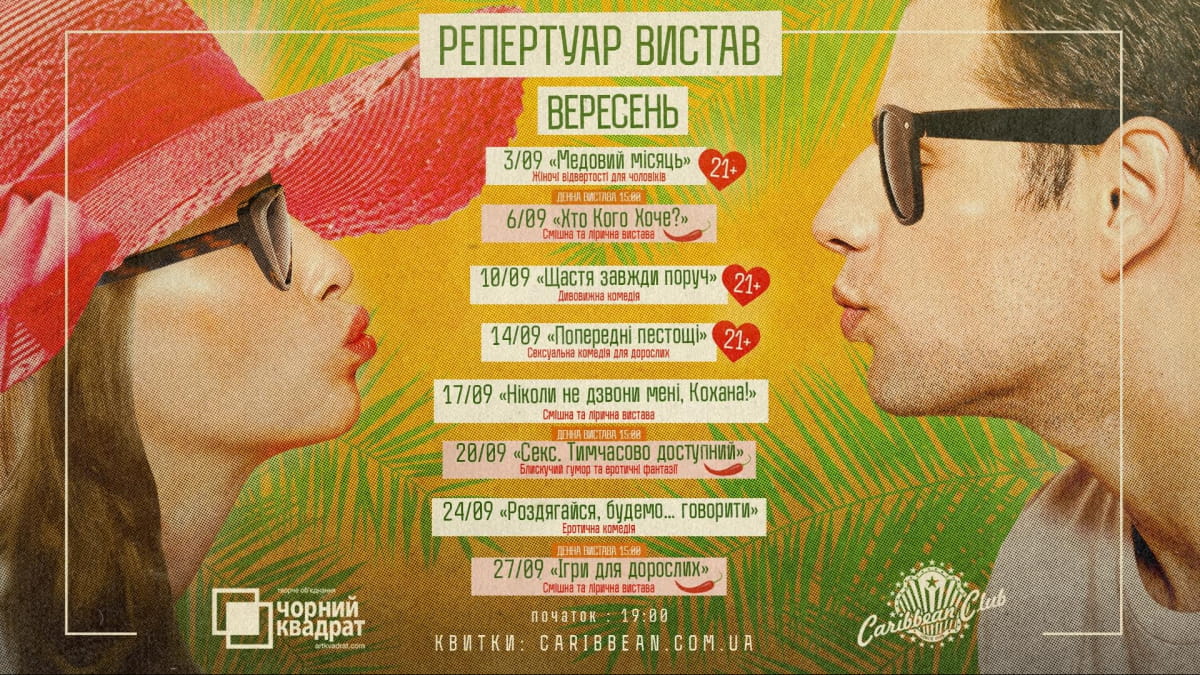 Спектакли проходят на украинском. Полное описание каждой постановки – на сайте Caribbean Club.