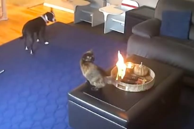 На кадрах можно увидеть, как кот и пес играют в гостиной. Мурчик сидит на столе рядом с горящей свечой.