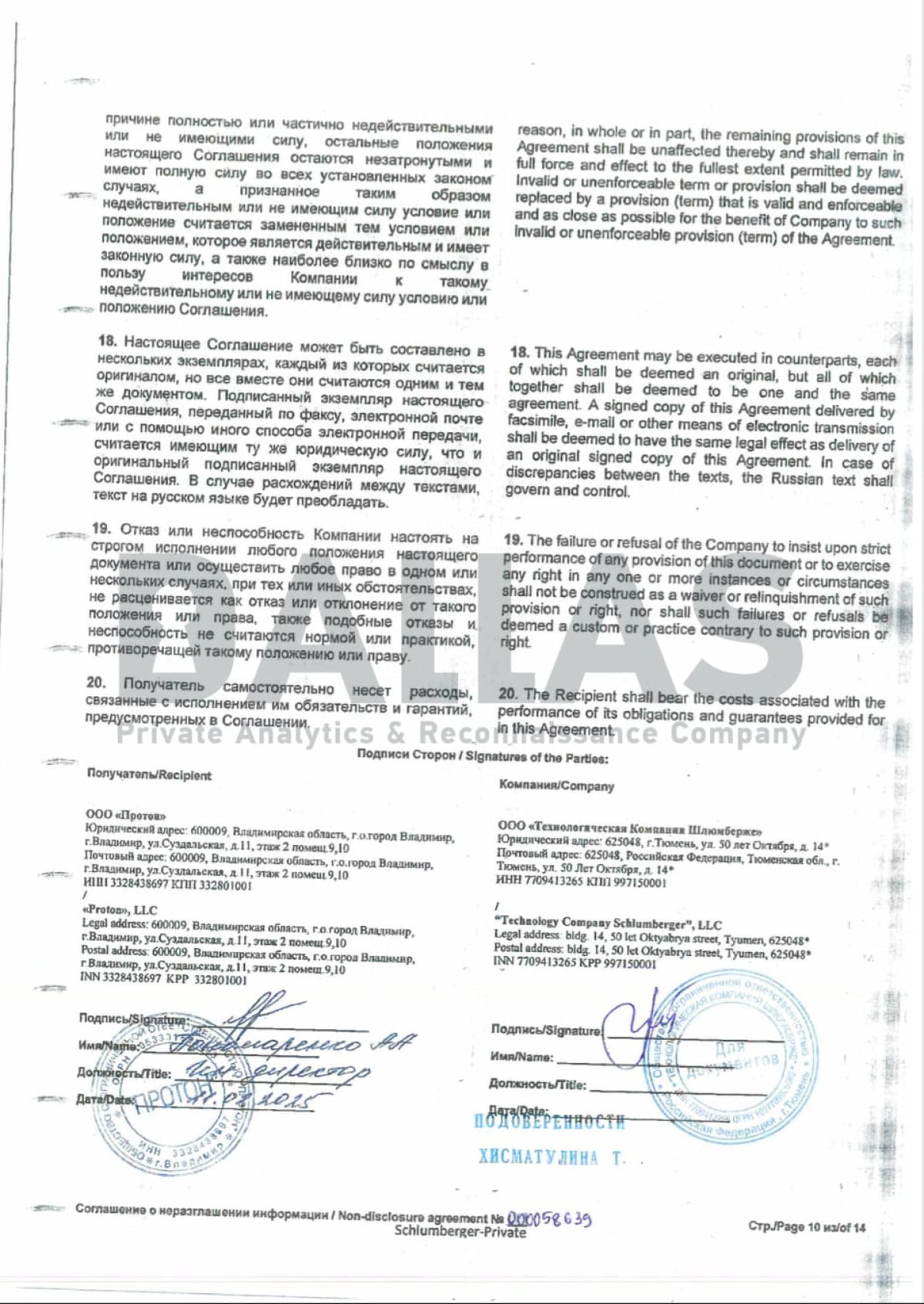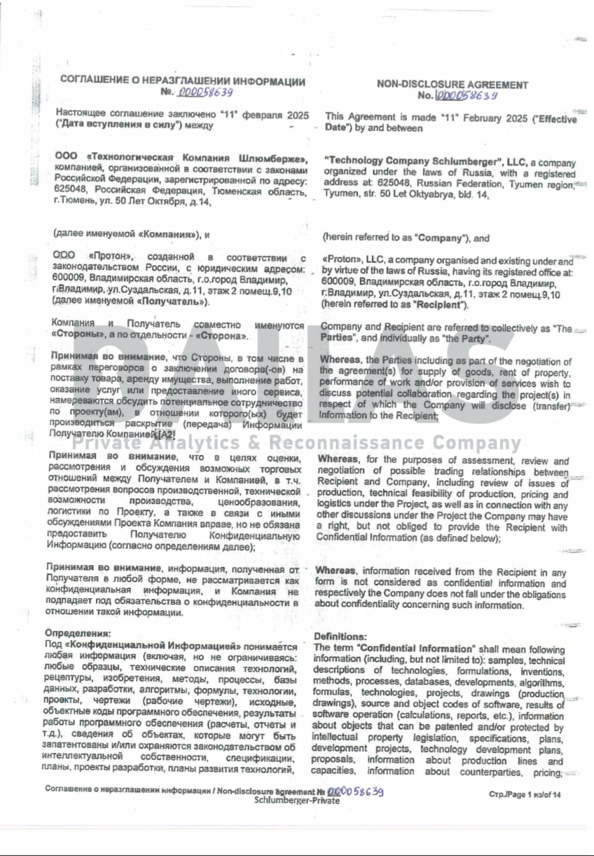 - "Технологическая компания Шлюмберже" заключила соглашение о неразглашении с заводом "Протон" (Владимир, россия) для производства компонентов погружных электродвигателей (ПЭДМТ-117) для нефтедобычи.