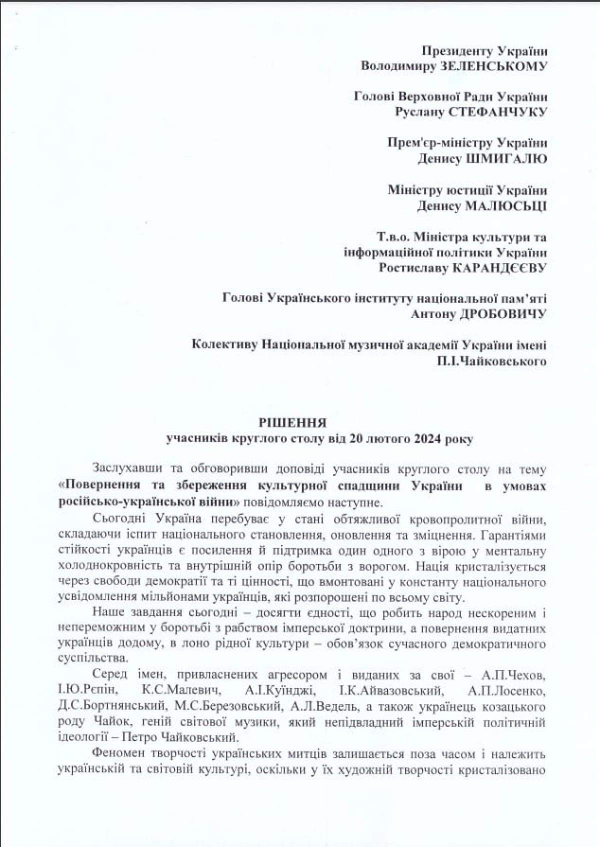 Результатом конференции стало обращение участников к президенту Украины, правительству и парламенту о необходимости создания государственной программы по возвращению сотен похищенных агрессором выдающихся имен украинских деятелей культуры. Собравшиеся подписали Акт противостояния стране-агрессору.