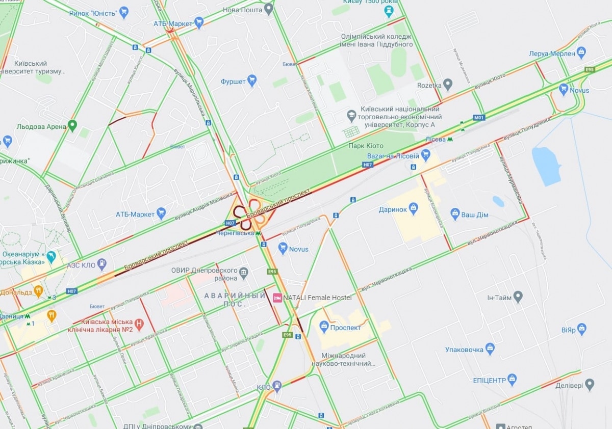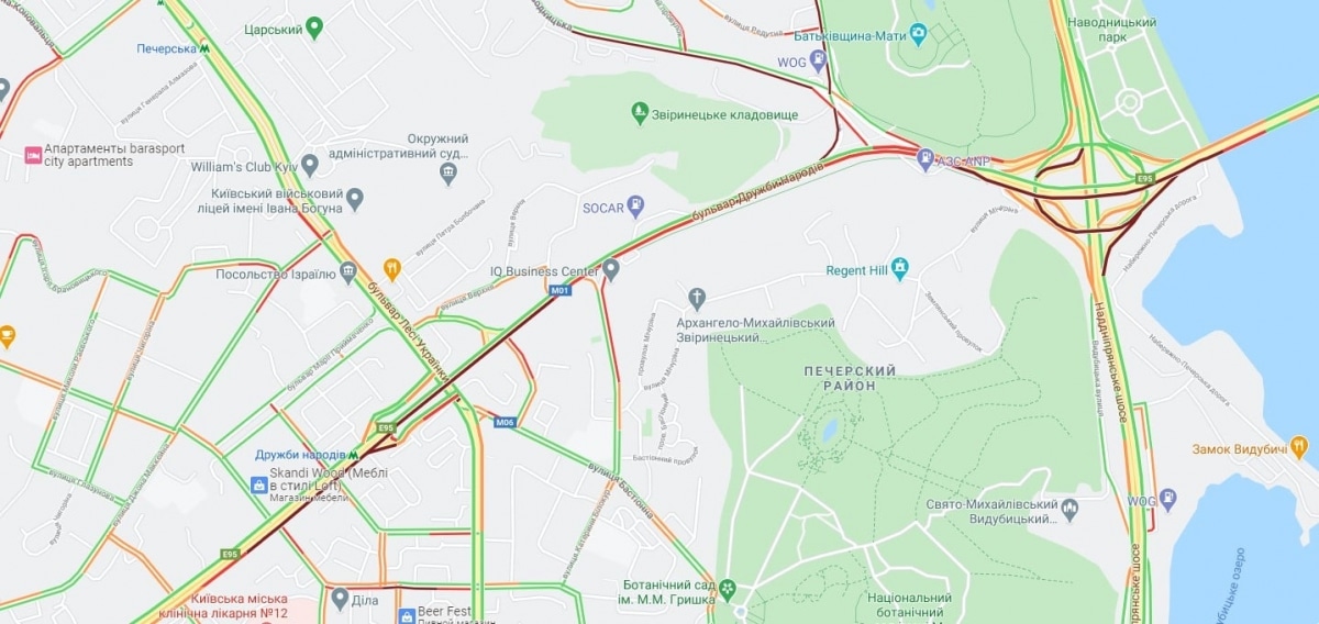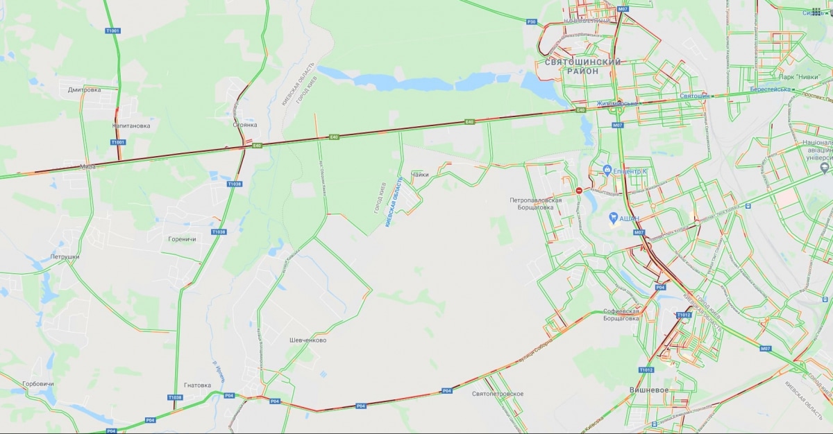 Также в значительной степени затруднено движение по Большой кольцевой дороге в район Борщаговки – в обоих направлениях. В том же районе стоят улицы Соборная и Киевская.