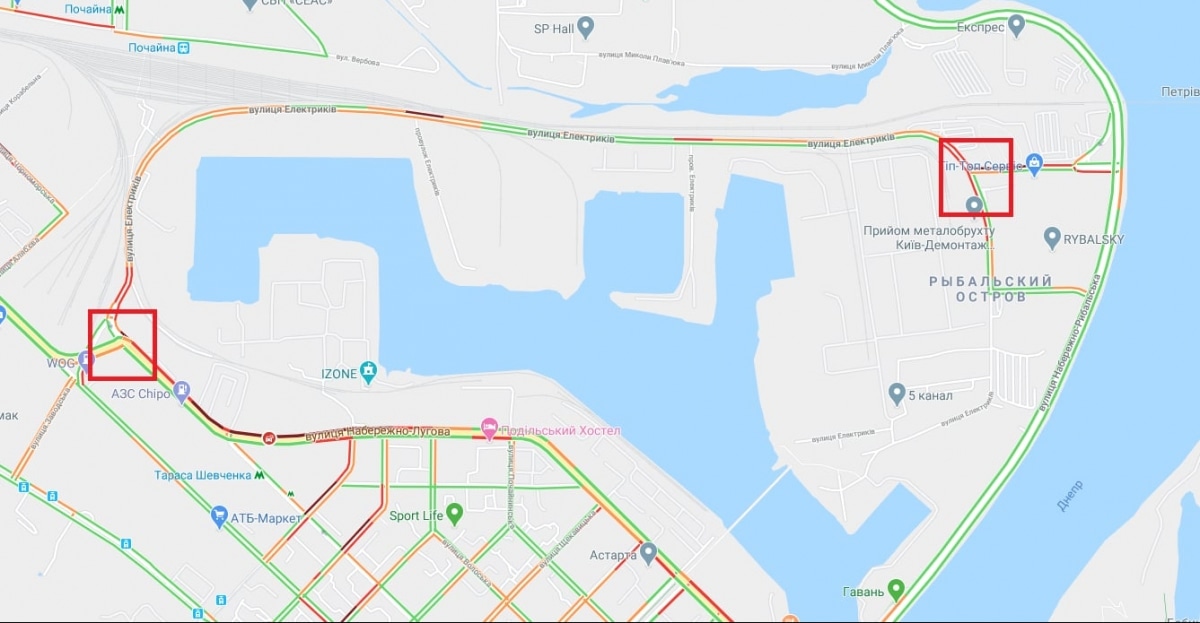 По состоянию на 18:30 автомобильное движение вокруг Рыбальского острова в Киеве значительно усложнилось.