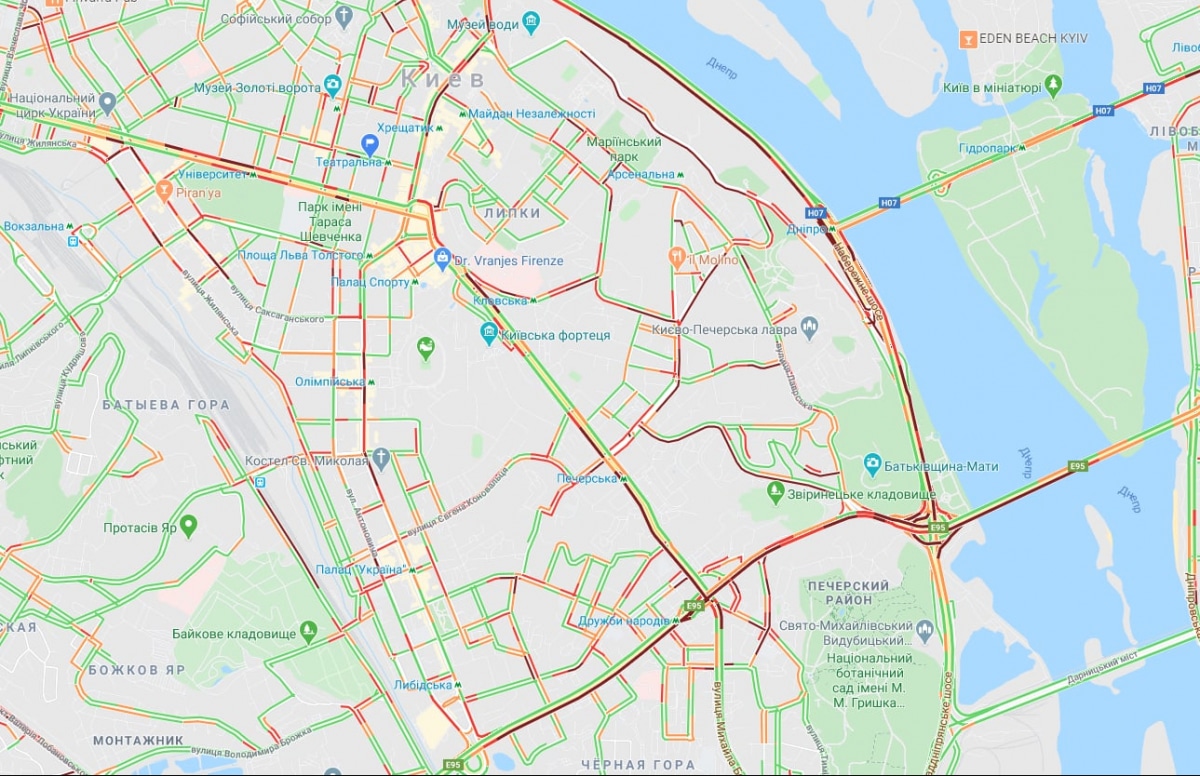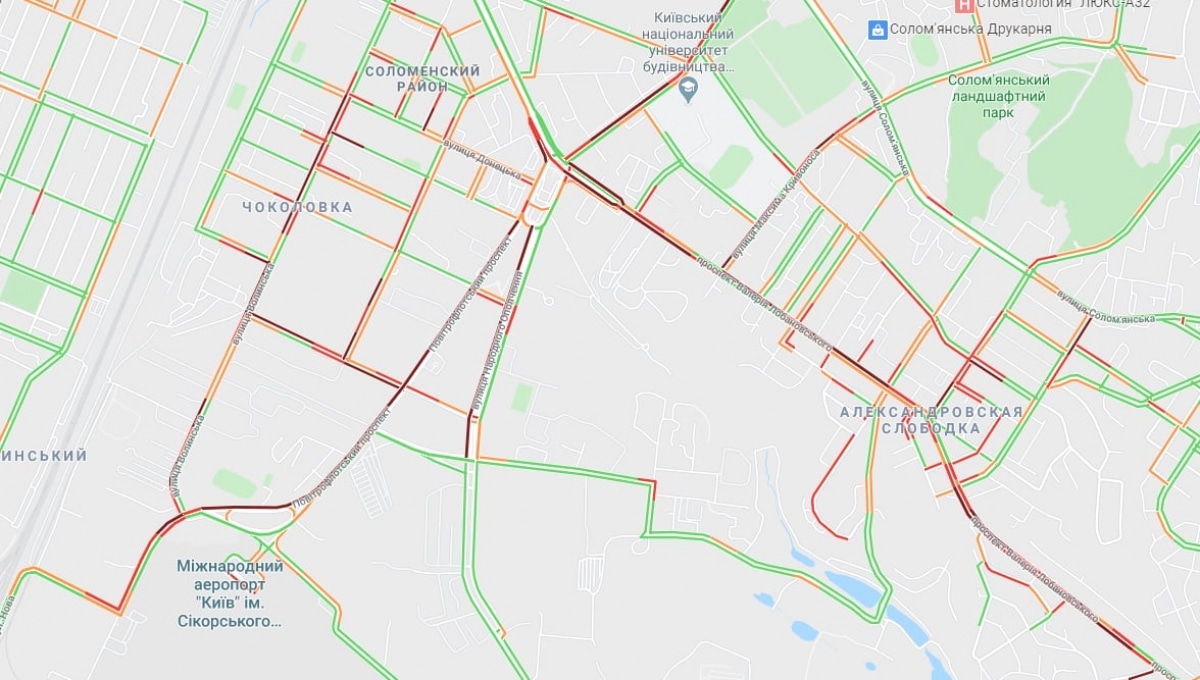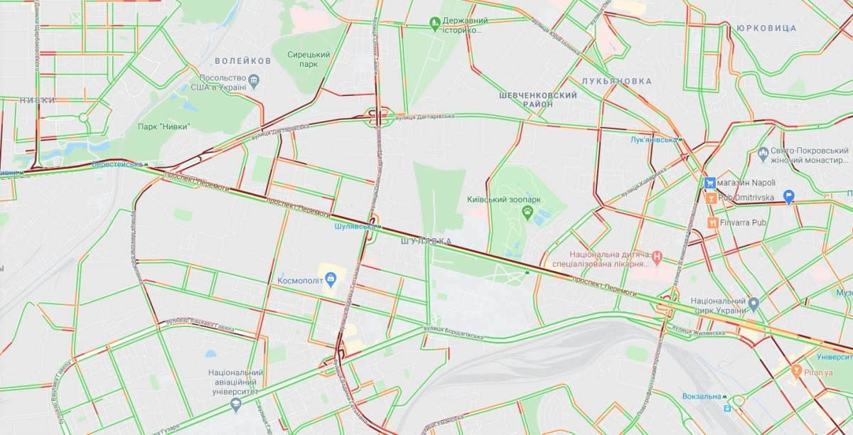 Также в безумных пробках бул. Леси Украинки, бул. Дружбы Народов, Набережное шоссе, мост Патона и развязка перед ним на правом берегу. Замер также просп. Победы от ст. м. "Политехнический институт до ст. м. "Нивки". Остановилось движение на ул. Довженко.