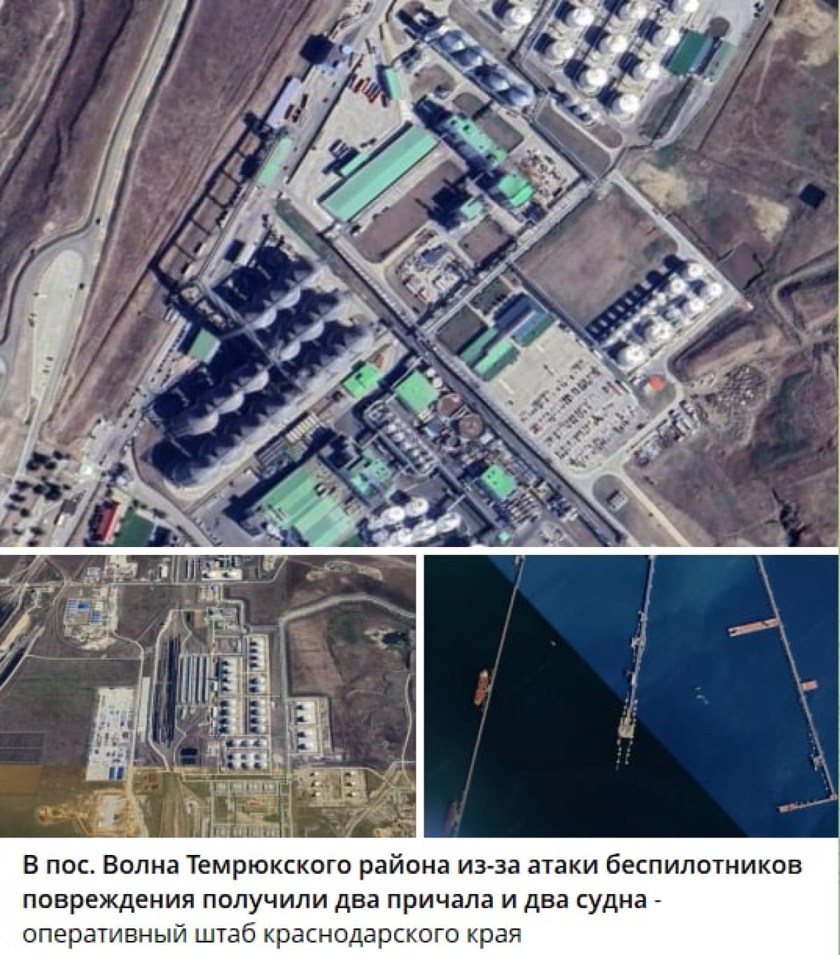 Согласно сообщениям оперативного штаба Краснодарского края рф, в поселке Волна Темрюкского района из-за атаки беспилотников повреждения получили два причала и два суда.