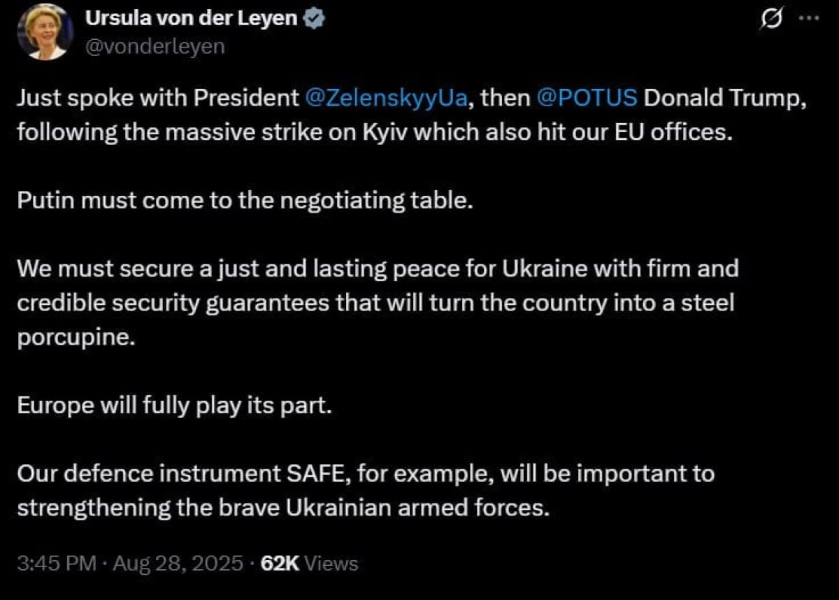 "Только что разговаривала с Президентом Зеленским, а затем с Президентом Трампом после масштабного удара по Киеву, который также задел наши офисы в ЕС", - написала она в соцсети X.