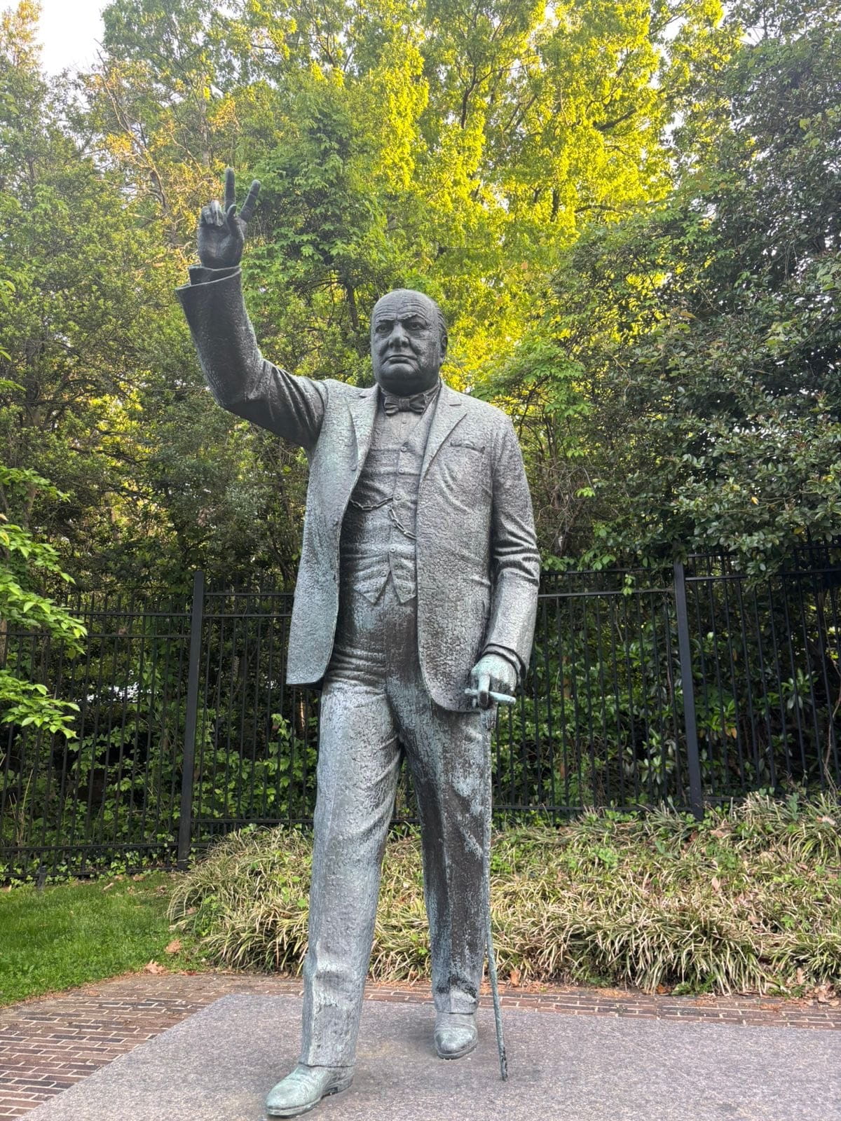 Выдающийся политик, запечатленный в бронзе, пророчески демонстрирует свой знаменитый жест "V" (Victory/Peace), что в нынешних реалиях воспринимается как напоминание о неизбежной победе справедливости и наступлении мира.